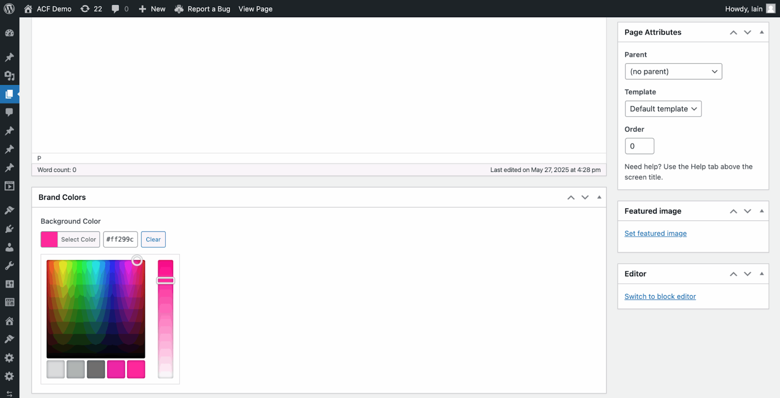 Custom color palettes in ACF 6.6 ensure brand consistency. Content authors can now use only brand-approved colors, streamlining workflows and improving alignment.