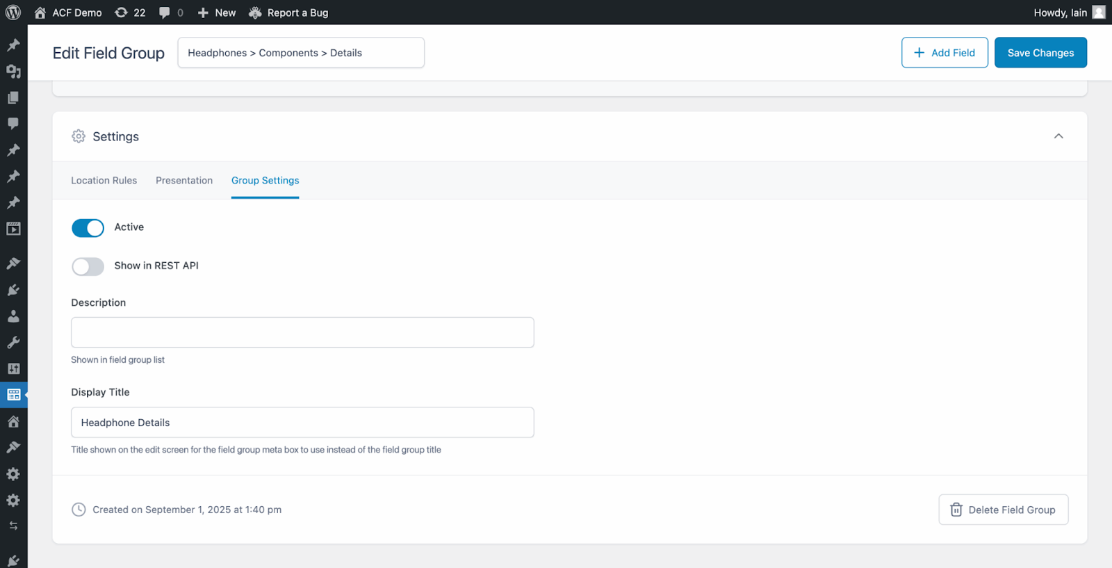 Have you ever created a field group with a name that made sense to you but confused your clients? ACF 6.6 now lets you set separate display titles for field groups. This new title is what your content authors will see when they’re editing a post or page, providing a more user-friendly label without changing the underlying field group name you use for development. No more field groups named “Homepage_Hero_Settings_v2” confusing your clients—they’ll see “Homepage Banner” instead.