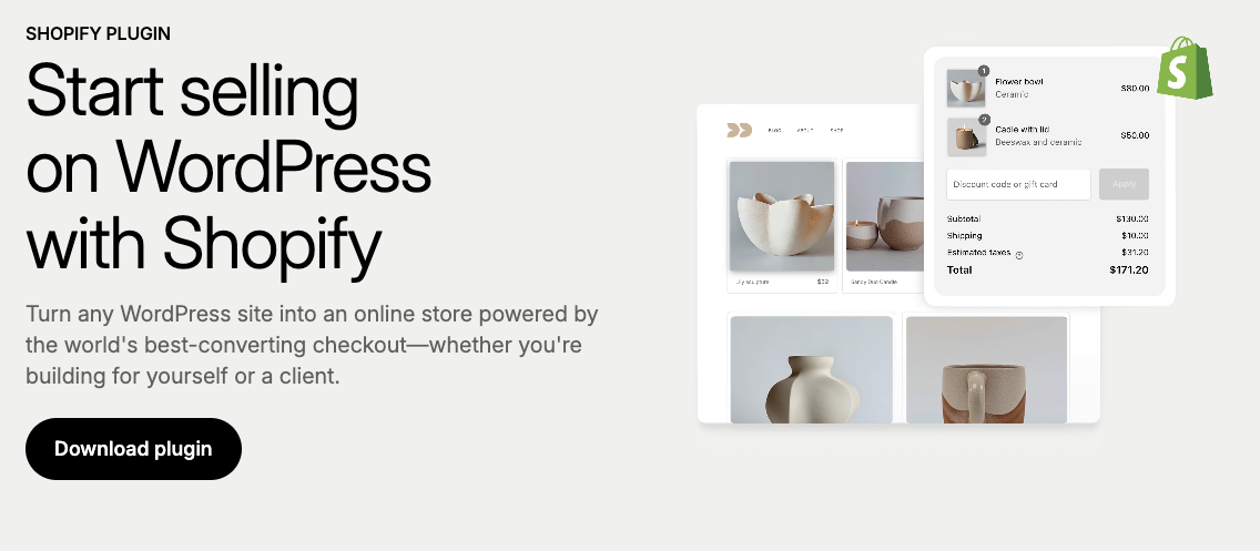 ShopifyⓇ is one of the most well-known eCommerce platforms on the market, and you can connect your Shopify store and your WordPress site with a simple plugin. This setup is ideal for businesses that already run a Shopify store but want to expand their content strategy through WordPress, allowing you to retain Shopify’s checkout, inventory management, and payment processing while using WordPress to publish optimized content.