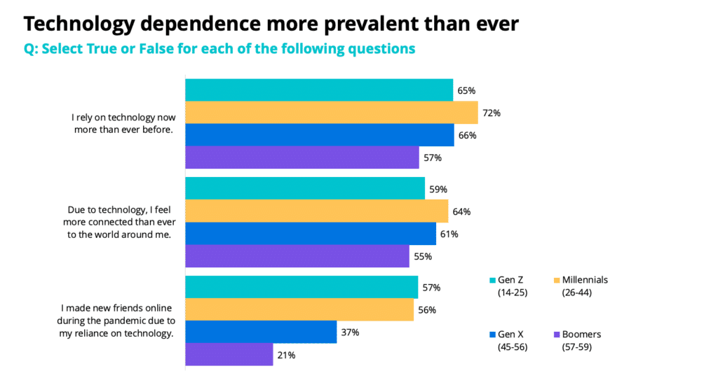 Dependency on the internet, however, shouldn’t be confused with dependency on technology as a whole. Our research found that even though web dependency has remained stable throughout the pandemic, dependence on technology has dramatically increased for every generation.