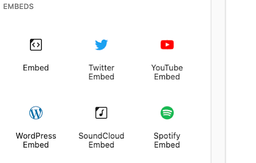 If you already have your files on another platform like SoundCloud, you can add them to your podcast posts easily as well. Click the ‘+’ icon again, and find the Embeds category of block options. There you can choose from many available blocks. For this example, let’s select the SoundCloud option, which you can see is right next to another popular block for Spotify: