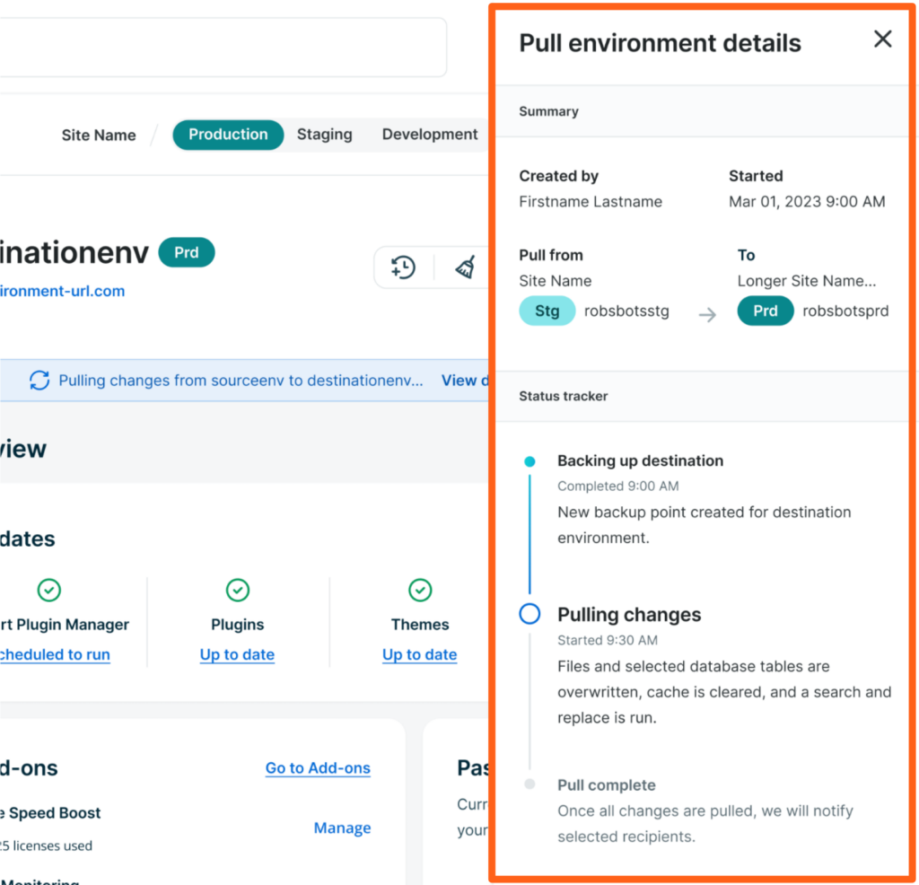 For example, if you want to add a new plugin, but you want to test it for compatibility before activating it on your live website, you can pull production to staging and then do all your testing there.