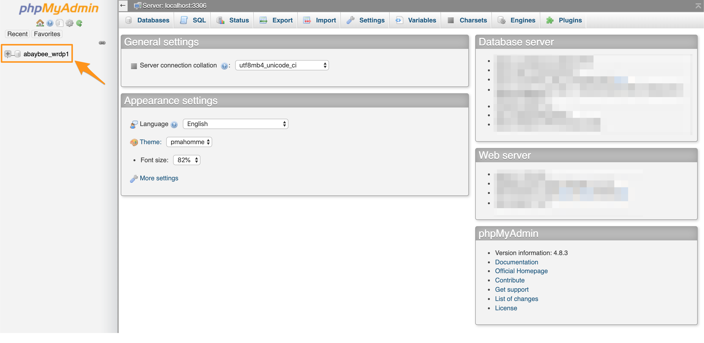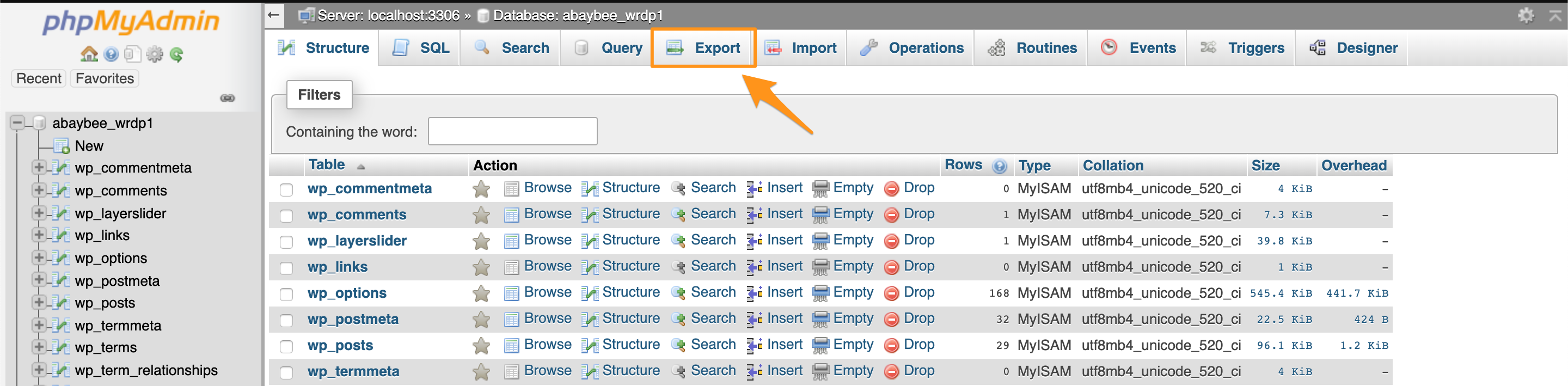 In the example below, the database used by the website we want to migrate is called abaybee_wrdp1.