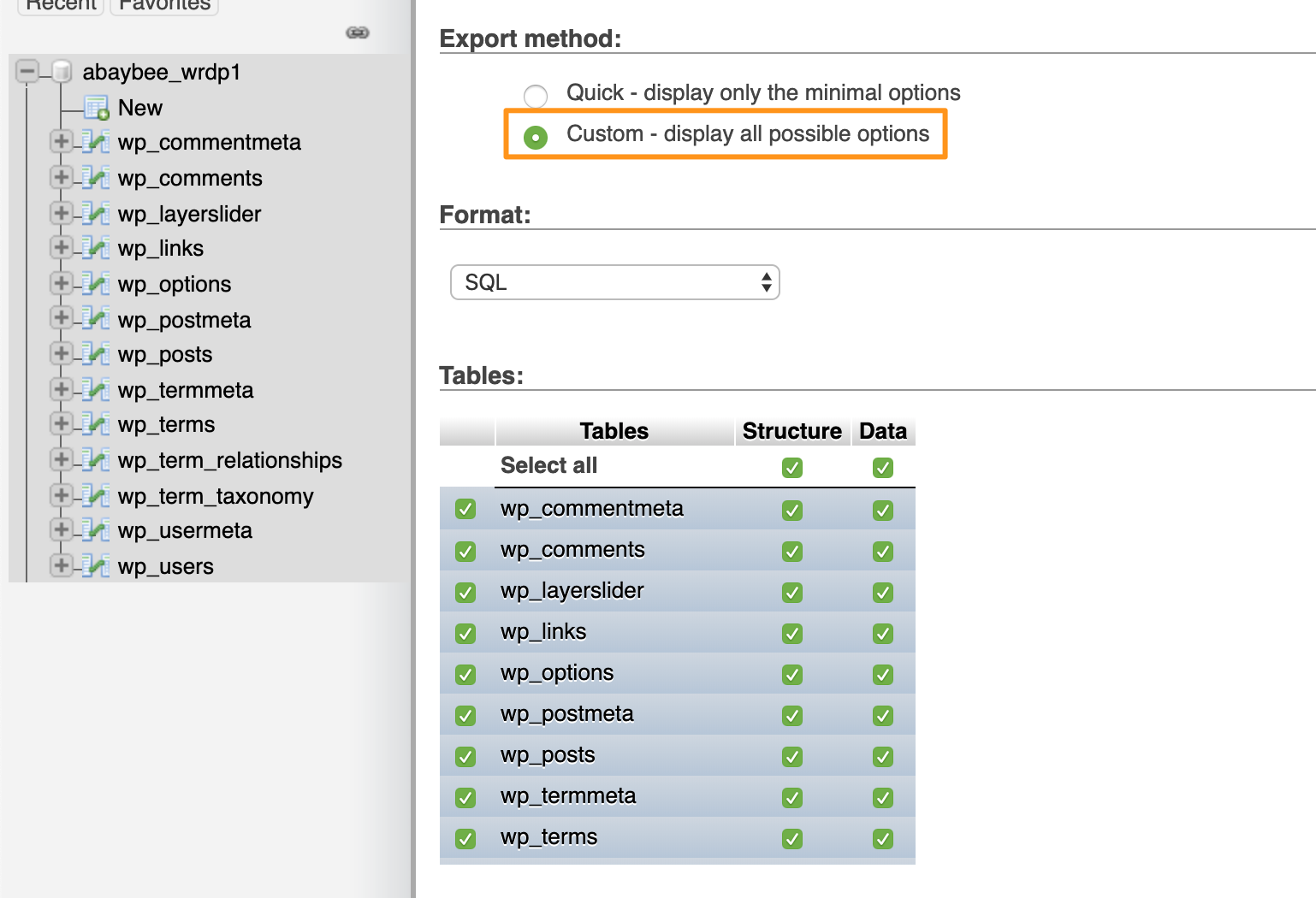 - Older versions of phpMyAdmin may not have an “Export Method” and will default straight to “Custom,” which is just fine.