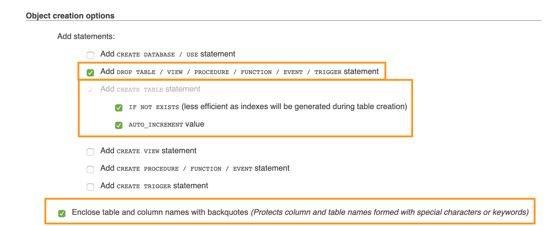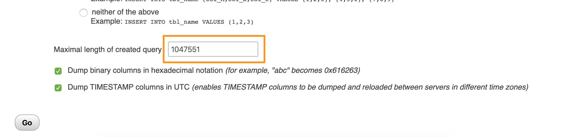 - The final piece to consider is Maximal Length of Created Query, which is found at the bottom of the Export page. For databases over 300MBs we highly recommend you alter the Maximal Length of Created Query to: 1047551