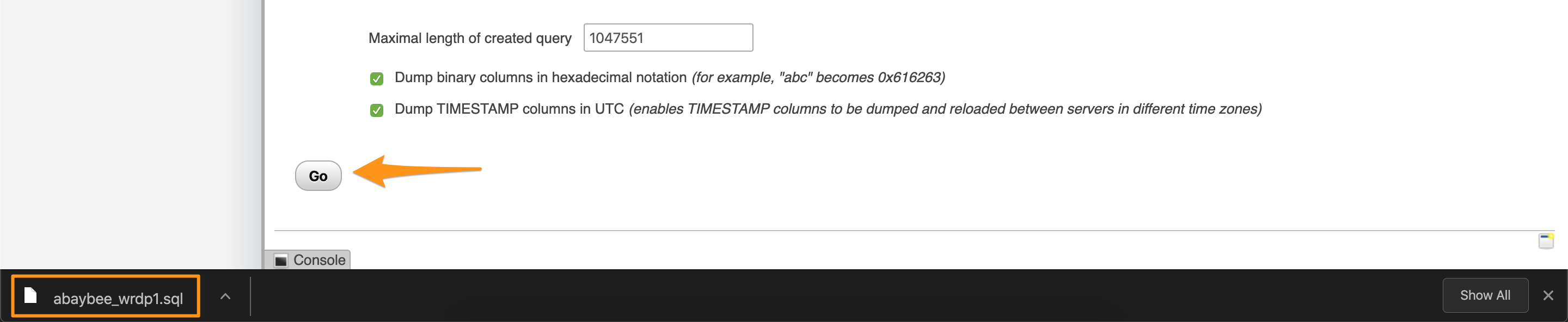 Click on the Go button at the bottom of the page. The database export will now save to your computer with a .SQL file extension (e.g. abaybee_wrdp1.sql in the screenshot below).